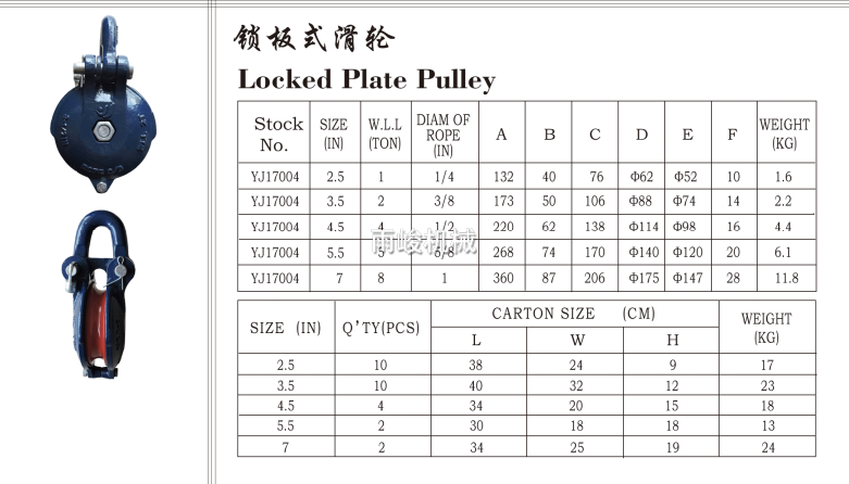 • 產(chǎn)品描述:該滑輪的拉力和尺寸均配合Snatch Block, 互相補(bǔ)充。表面處理為熱鍍鋅,電鍍鋅,噴塑等,均根據(jù)客戶要求。