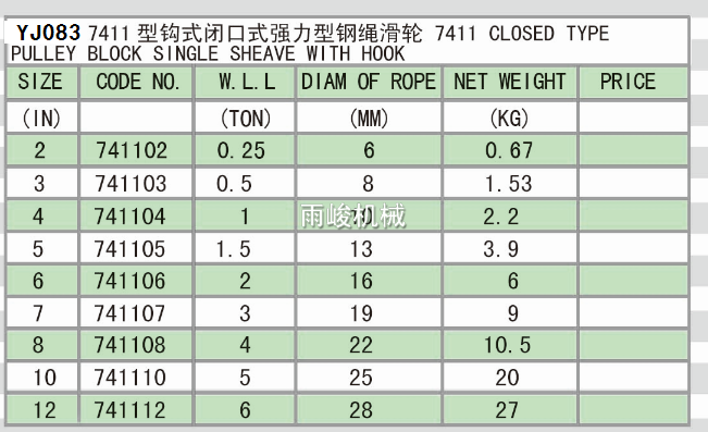 YJ083 7411 CLOSED TYPE PULLEY BLOCK SINGLE SHEAVE WITH HOOK